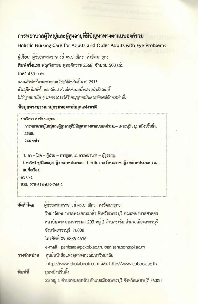 การพยาบาลผู้ใหญ่และผู้สูงอายุที่มีปัญหาทางตาแบบองค์รวม =Holistic nursing care for adults and older adults with eye problems